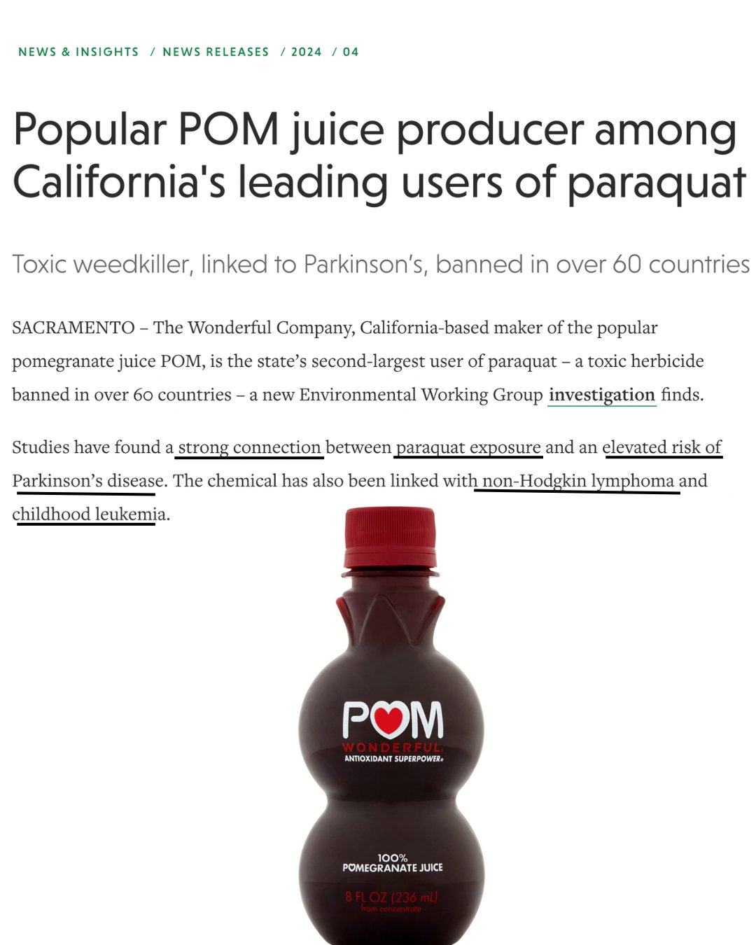 I had no idea about this, literally had a glass of this juice today. Paraquat is far far worse than glyphosate, have heard of plenty folks personally affected by it. If you drink POM I strongly suggest you find an alternative like a hand held juicer along with actual pomegranates or Lakewood Organic Pomegranate Juice.