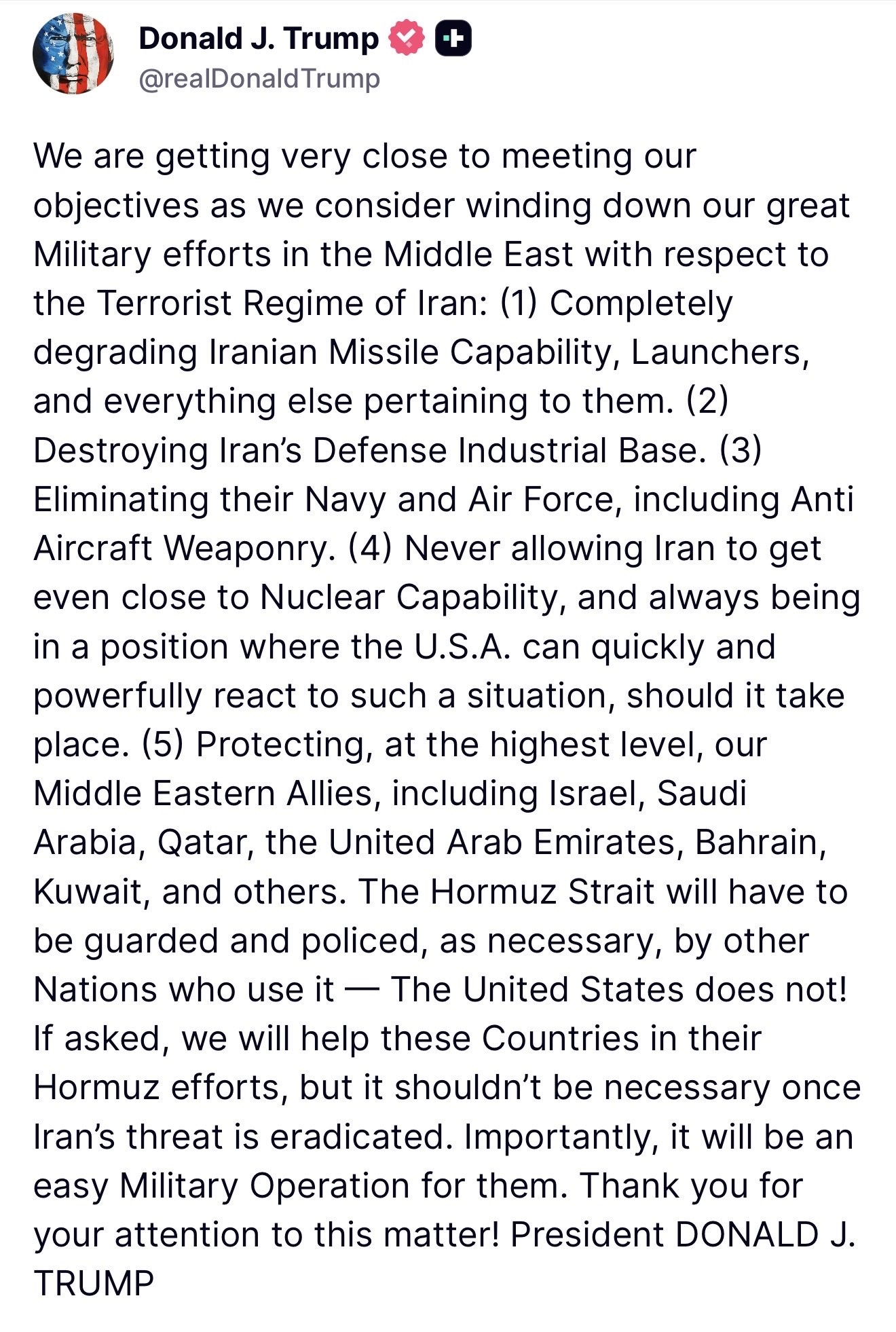 Tomorrow marks week 3 - and the U.S. Armed Forces are doing an exceptional job. Day by day, the Iranian Regime is being crippled, and their ability to threaten the United States and our allies is being significantly weakened.